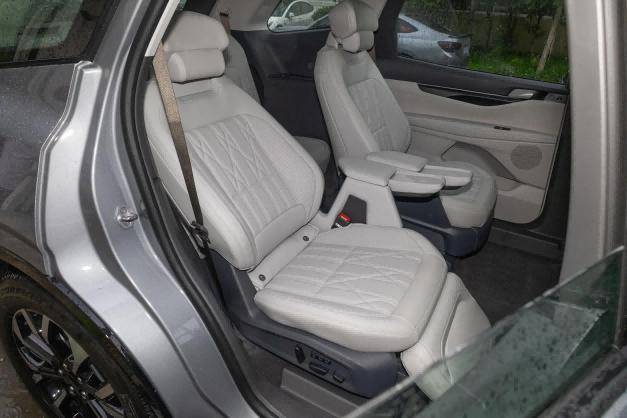 比較驚喜的是,可選裝的2+2+3座椅布局,它由兩個獨立的寬大座椅組成,不僅乘坐舒適,還支持通風、加熱,能實現“一鍵舒躺”坐姿。它不僅支持電動前后滑軌移動,座椅中央還有寬至200mm的中央通道,家人進入第三排,直接從二排自由走動,更加舒適便捷。