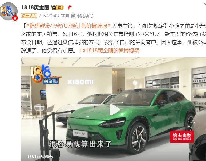 近日,據浙江電視臺6頻道《1818黃金眼》報道,小米汽車實習銷售小駱(化名)因提前預測小米YU7的價格和發布會日期,并將這些信息通過微信群發給意向客戶,隨后被公司辭退。
