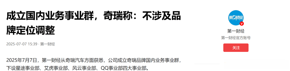 此外,奇瑞方面回應媒體稱,此次僅為內部機構的調整,不涉及旗下品牌的定位調整。