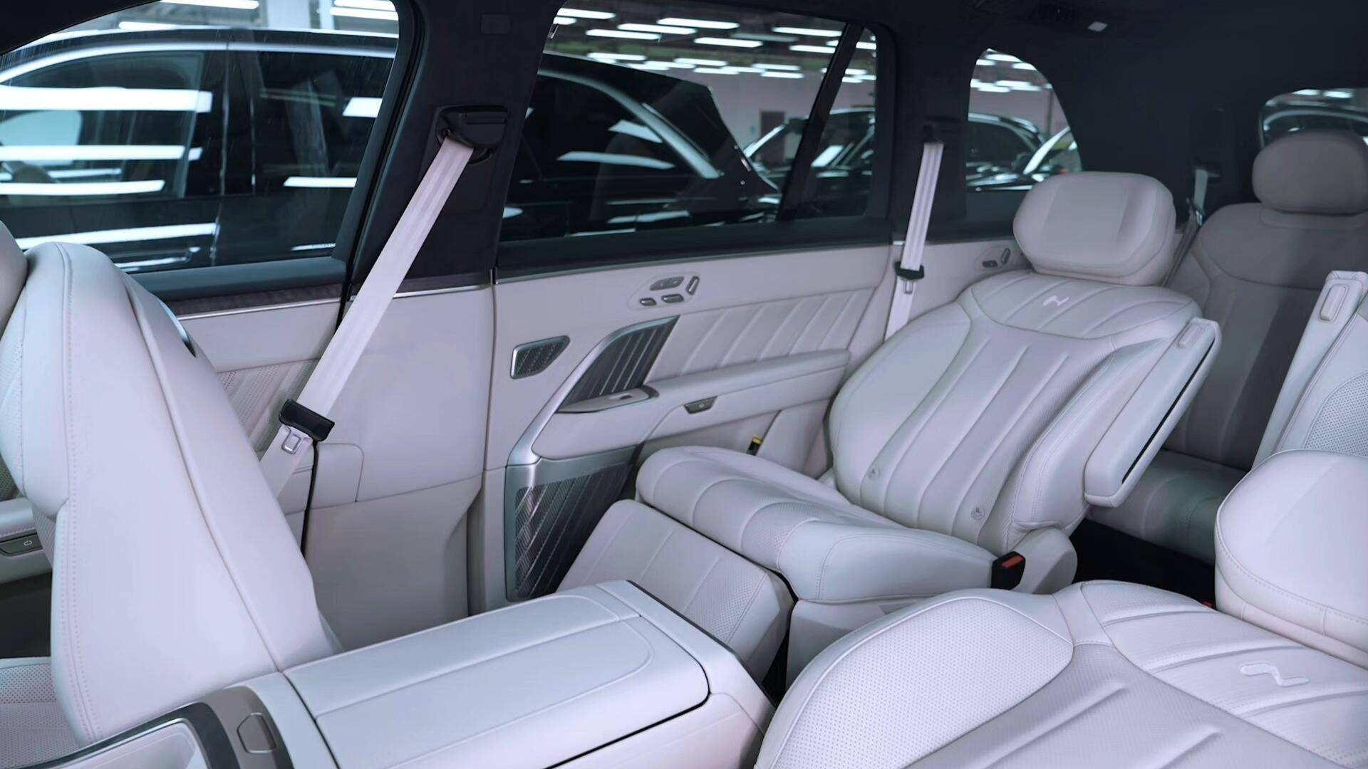 車內采用2+2+2式的6座布局,二排右側為帶電動腿托的零重力座椅,預計通風、加熱、按摩等功能也均不會缺席,同時還提供功能控制屏、車載冰箱、吸頂娛樂屏、折疊小桌板、雙天窗以及ONVO SOUND音響系統等配置,乘坐舒適性不言而喻。而第三排座椅也支持電動調節/加熱等功能。