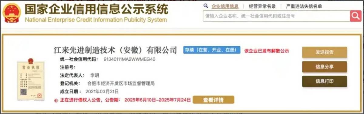 該公告內容顯示:江來先進制造技術(安徽)有限公司發布解散公示,注銷的原因為“決議解散”,公告期為6月10日至7月24日。
