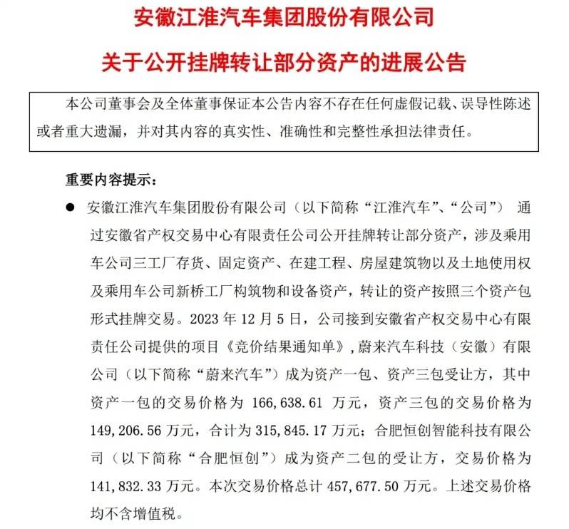 而最終結果,果然也是沒有任何意外,蔚來汽車科技(安徽)有限公司成為資產一包、資產三包受讓方,其中資產一包的交易價格為16.66億元,資產三包的交易價格為14.92億元,合計為31.58億元。