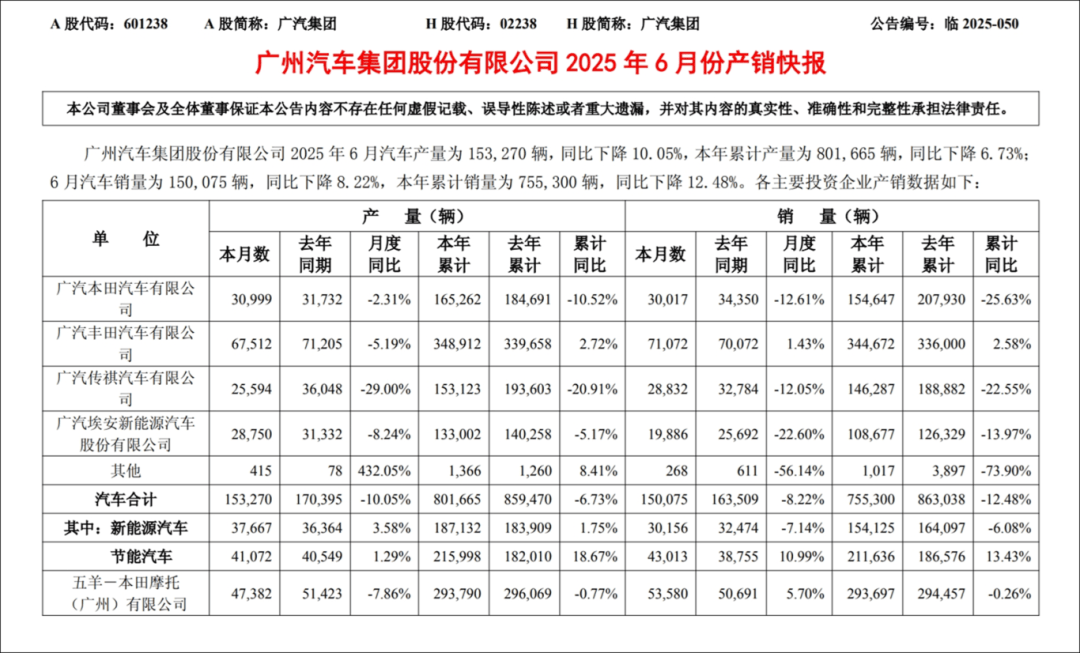 在廣汽集團官方公布的產銷數據中,我們可以看到的是,6月全集團汽車銷量為15萬輛,環比上升27.5%,旗下四個子版塊6月銷量均實現環比增長。其中,節能車月銷量為43013輛,同比提升10.99%。同時,上半年,廣汽國際出口累計同比增加45.8%。