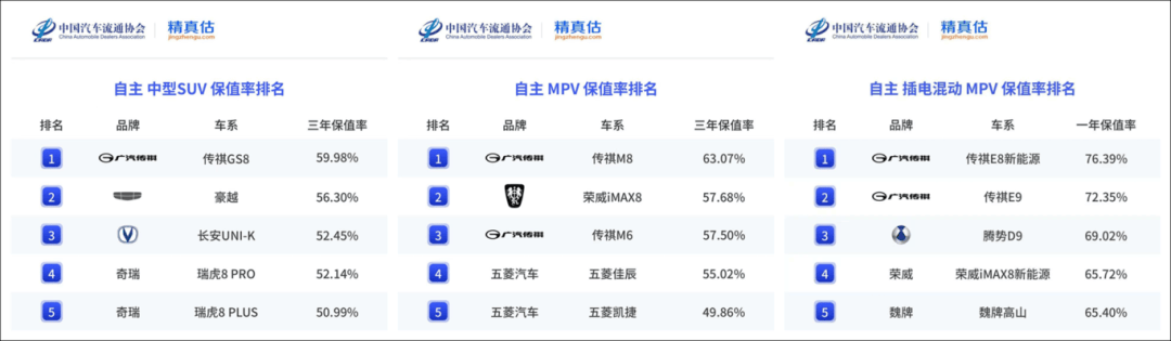 不僅如此,截至今年5月,廣汽傳祺位居自主品牌MPV對公銷量第一。此外,在7月3日中國汽車流通協會和精真估聯合發布的《2025上半年中國汽車保值率報告》中,傳祺品牌以三年保值率57.29%獲得自主品牌保值率第一。