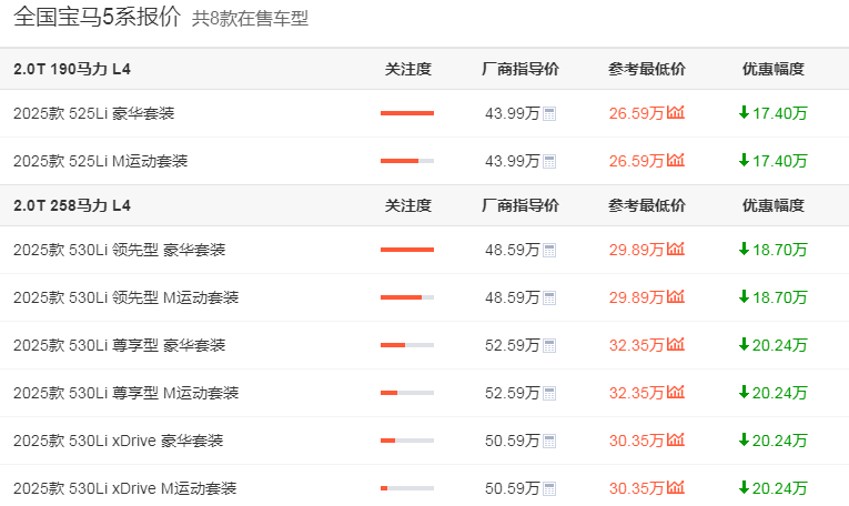 日前,北京多家寶馬4S店對2025款525Li 豪華套裝給出最低26.3萬元的裸車報價,疊加貸款、購置稅、保險等費用后,落地價約32.5萬元。而根據小編從車主之家查詢的消息來看,也是差不多的行情。具體來看,如今全國共有8款寶馬5系在售,廠商最低指導價為43.99萬,優惠幅度超過了17萬,這也使得該車的裸車最低價降到了26萬左右。