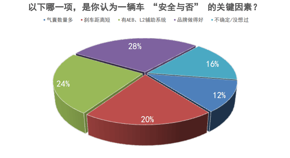 在“你認(rèn)為汽車安全與否的關(guān)鍵因素”一題中,超過一半的受訪者選擇了“氣囊數(shù)量多”“剎車距離短”或“有AEB輔助系統(tǒng)”,還有16%的人甚至沒有想過或不確定這一問題。
