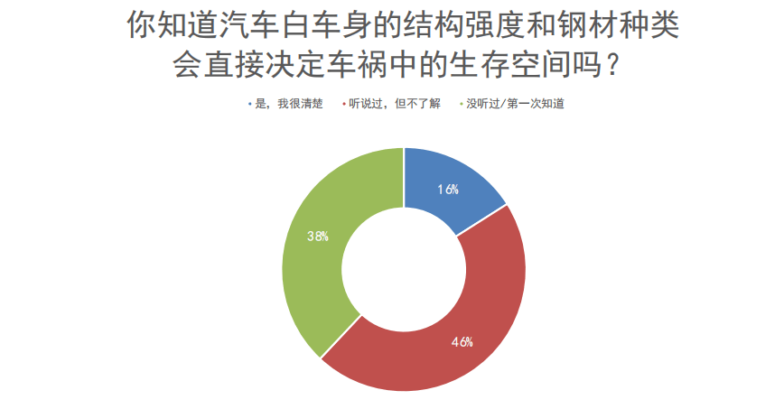 在問到“你是否了解白車身結(jié)構(gòu)強(qiáng)度和鋼材種類會(huì)決定車禍中的生存空間”時(shí),近三分之二的受訪者表示“沒聽過”“第一次聽說”或者“聽說但是不了解”。