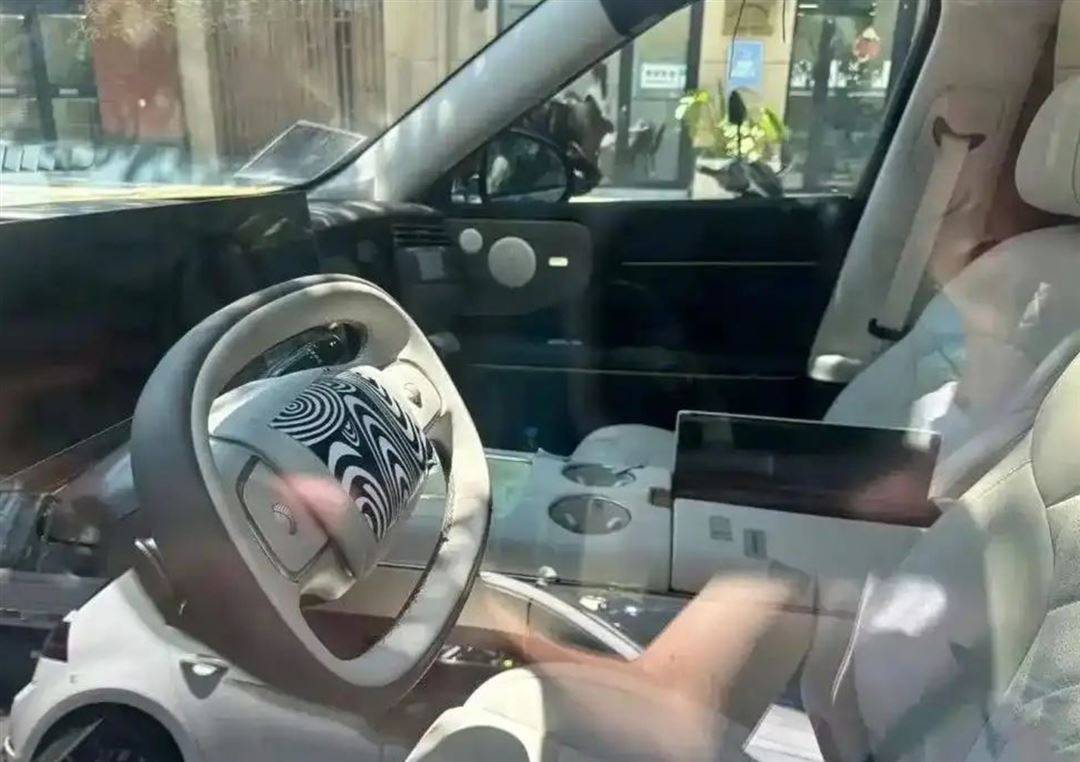 車內(nèi)目前只看到一張照片,中控臺采用大連屏的設計,副駕駛正前方也是配備副駕娛樂屏的。方向盤造型很新穎,和蔚來ET9類似,預計中間扶手下方是冷暖冰箱。
