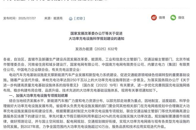 日前,國家發改委等四部門聯合印發《關于促進大功率充電設施科學規劃建設的通知》。