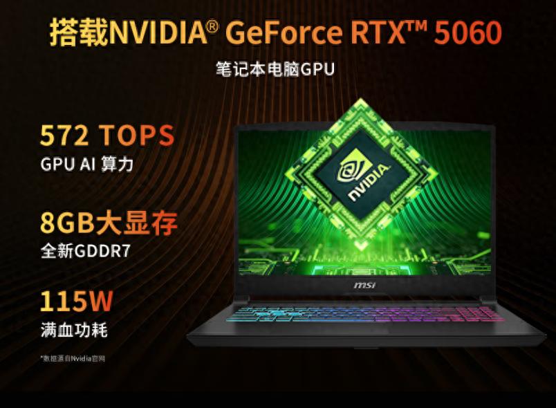 先看看這個RTX5060顯卡,8GB GDDR7顯存,3328個CUDA核心,572 TOPS算力,可以實現115W性能釋放。