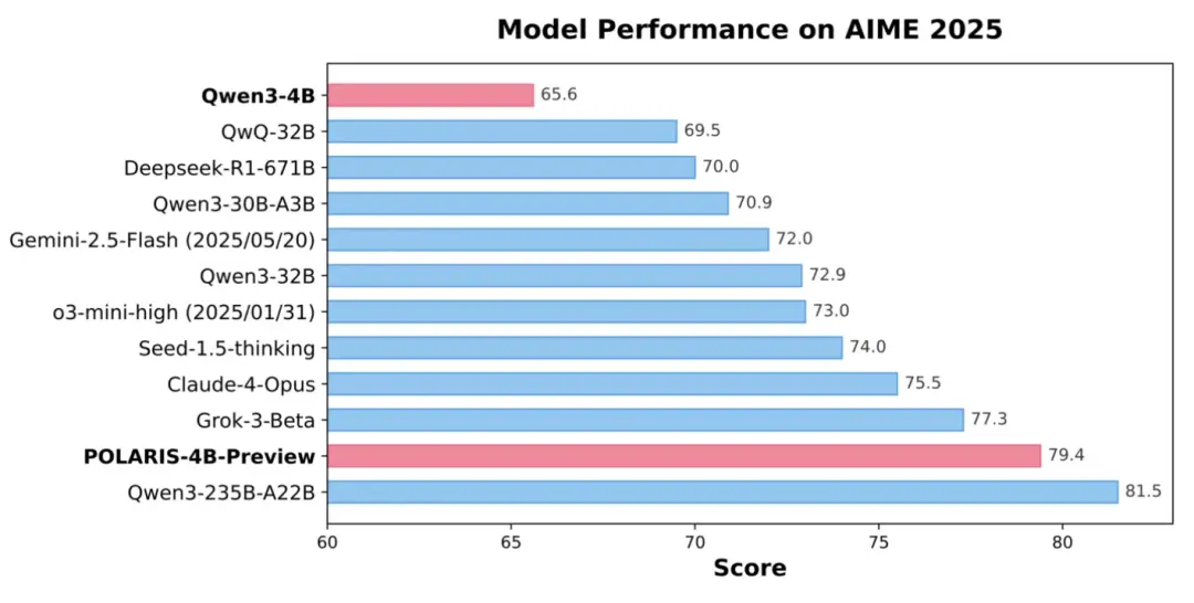 通過Scaling RL,Polaris讓4B模型的數(shù)學推理能力(AIME25上取得79.4,AIME24上取得81.2)超越了一眾商業(yè)大模型,如Seed-1.5-thinking、Claude-4-Opus和o3-mini-high(25/01/31)。