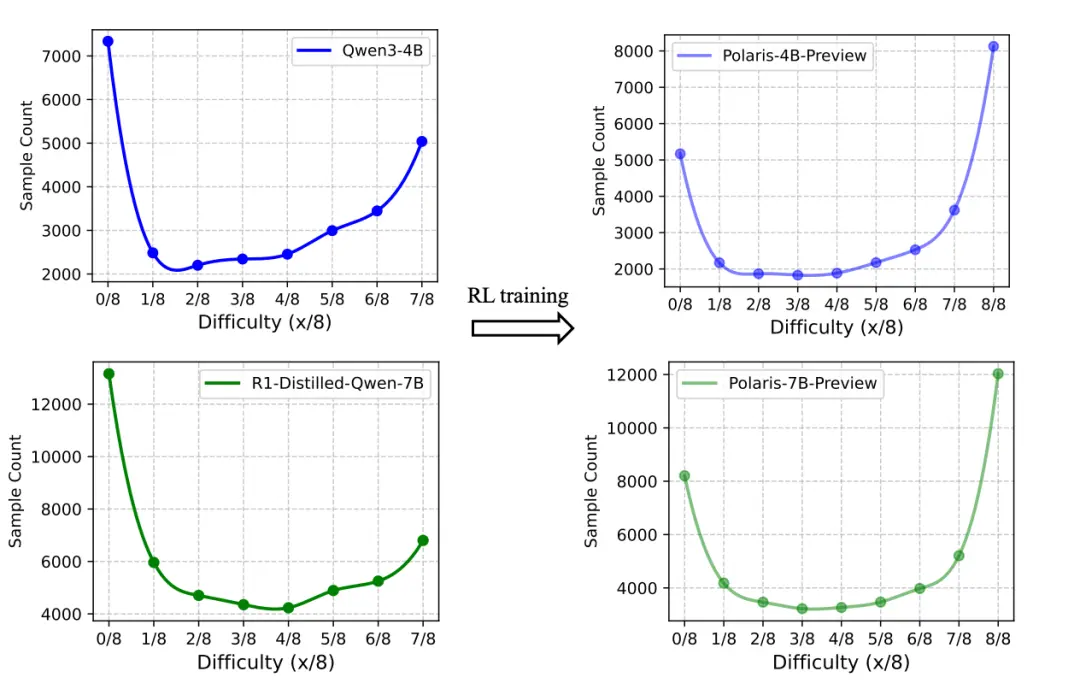 Polaris團隊發(fā)現(xiàn),對于同一份數(shù)據(jù),不同能力的基模型展現(xiàn)出的難度分布呈現(xiàn)出鏡像化的特征。、