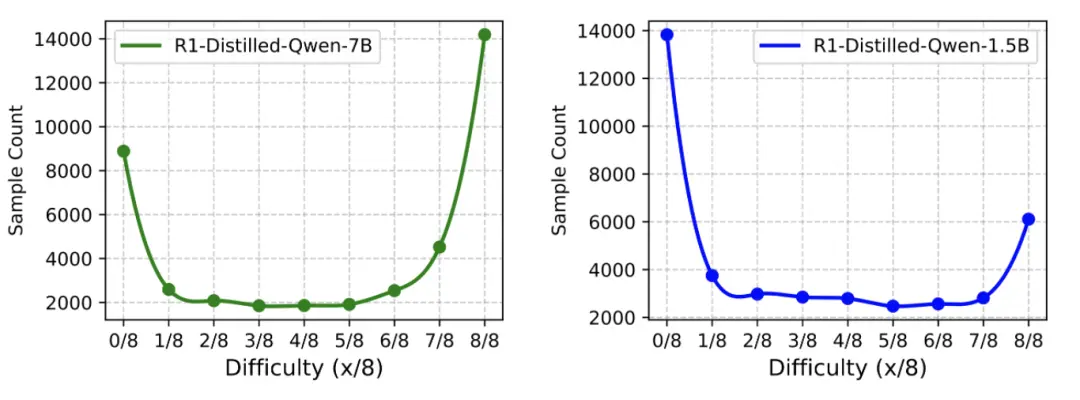 實驗結果顯示,大多數(shù)樣本位于兩端(8/8正確解答或0/8正確解答),意味著該數(shù)據(jù)集雖然對1.5B模型具有挑戰(zhàn)性,卻不足以有效訓練7B模型。