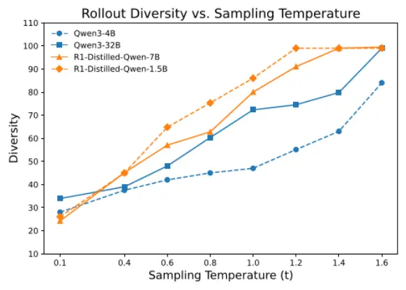 Rollout階段的多樣性主要通過topp、topk與溫度t來調控。當前大多數(shù)工作都采用topp=1.0和topk=-1,這已經(jīng)達到了最大的多樣性,但采樣溫度t還沒有統(tǒng)一的設置。