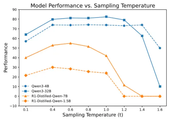 Polaris團隊發(fā)現(xiàn)模型性能隨溫度升高呈現(xiàn)“低-高-低”的趨勢。例如,把采樣溫度設置成1.0,對于Deepseek-R1-distill系列模型過高了,而對于Qwen3系列來說又有點低。