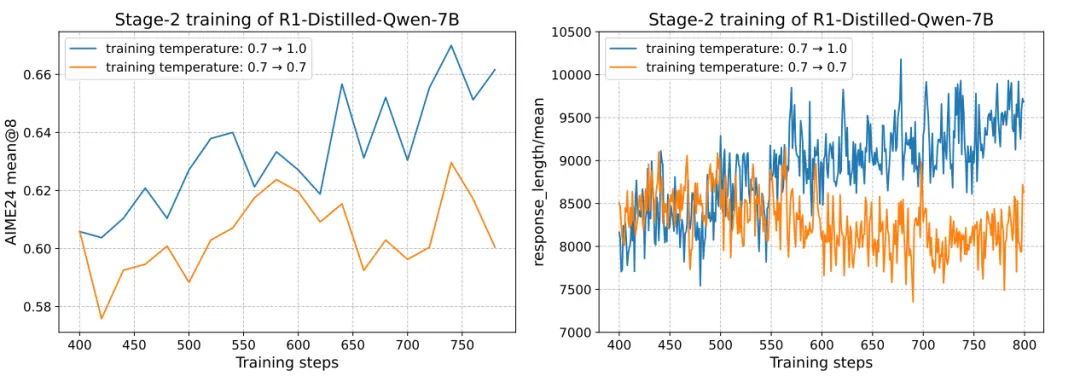多階段溫度調整不僅帶來了更優(yōu)的RL訓練效果,還使得回答長度的提升更加穩(wěn)定。