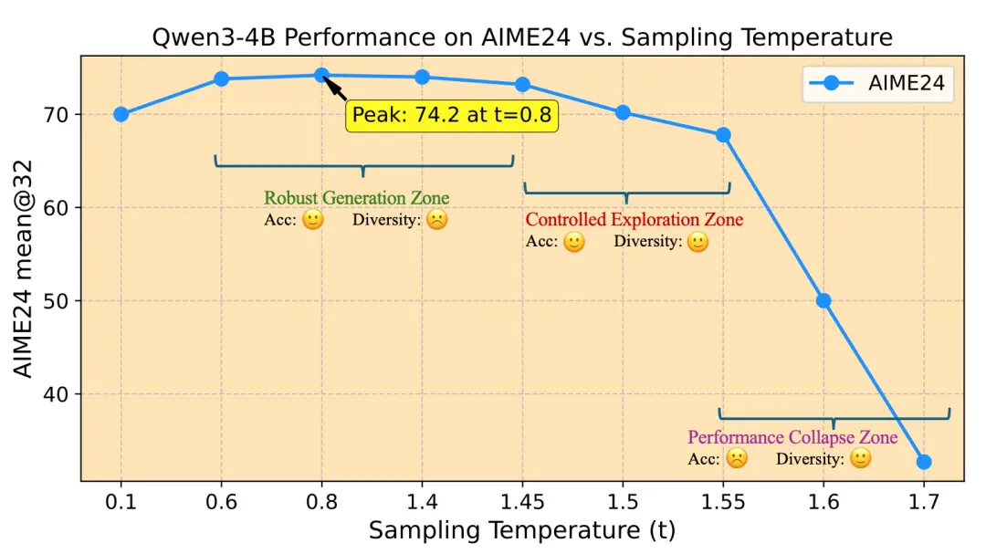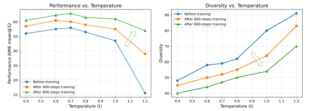 實驗顯示,常用的t=0.6或t=1.0的設置溫度過低,限制了模型的探索空間,導致難以挖掘RL潛力。