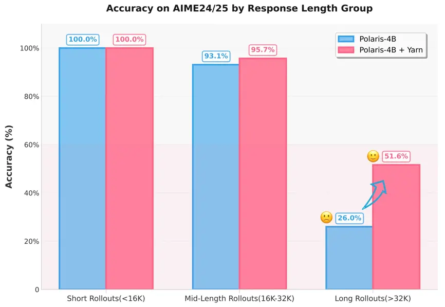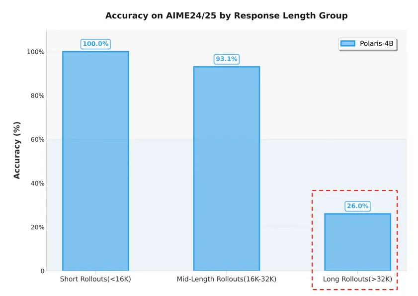 Qwen3-4B的模型預訓練上下文長度僅有32K,而RL階段Polaris將最大訓練長設定為52K。但實際達到最大序列長度的訓練樣本比例不足10%,意味著真正使用長文本進行訓練的樣本非常有限。