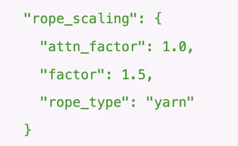 具體實現(xiàn)上,研究團隊采用了YaRN作為外推方法,并設置擴展因子為1.5,如下配置所示:
