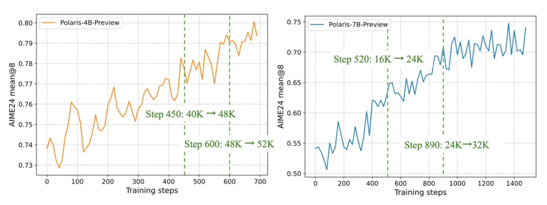Polaris采用多階段的訓練方式,在早期階段,模型使用較短的上下文窗口;待模型表現(xiàn)收斂后,再逐漸增加上下文窗口的長度以拓寬模型的推理能力。