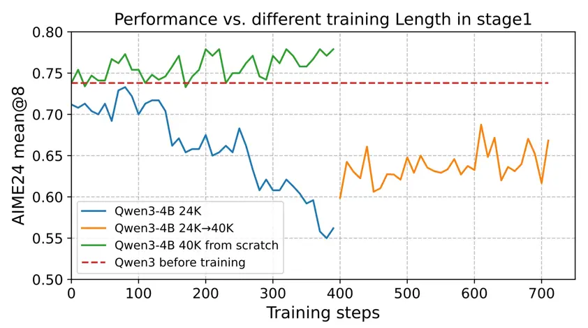 通常來說,從一開始就讓模型“思考更長”會更安全:對于Qwen3-4B,實驗觀察到從零開始使用40K響應長度時性能穩(wěn)步提升,這與從一開始就采用24K和24K→40K的方案形成了鮮明對比。