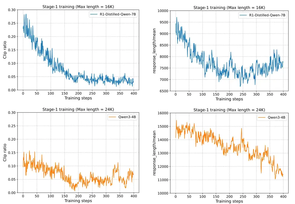 實驗發(fā)現(xiàn),對于DeepSeek-R1-Distill-Qwen-1.5B/7B,采用較短的響應長度訓練效果都較好;但對Qwen3-4B來說,即使響應長度只有24K且響應截斷比例低于15%,其性能也會急劇下降,這種下降即使在后期階段也難以恢復。