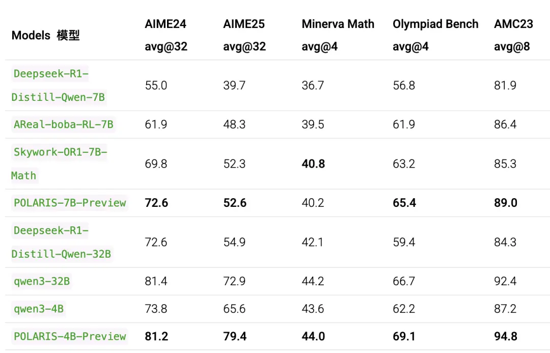 Polaris模型需要使用比Qwen3更高的采樣溫度和更長的響應長度;所有其他設置保持相同。