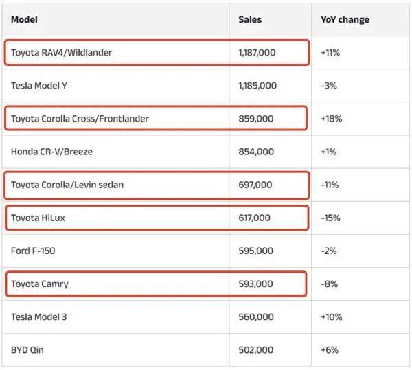 近期,據市場研究機構JATO Dynamics數據顯示,RAV4以118.7萬輛的銷量,成為全球單一車型銷冠,直接把23年的銷冠Model Y甩在了身后。