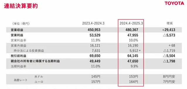 豐田2024財年(2024.4-2025.3),營收48.37萬億日元,約2.4萬億人民幣(同比+6.5%),凈利潤4.765萬億日元,約2381億人民幣(同比-3.6%)。這凈利潤啥概念?與比亞迪、長安、上汽等7家國內頭部車企的凈利潤總和還多3倍!
