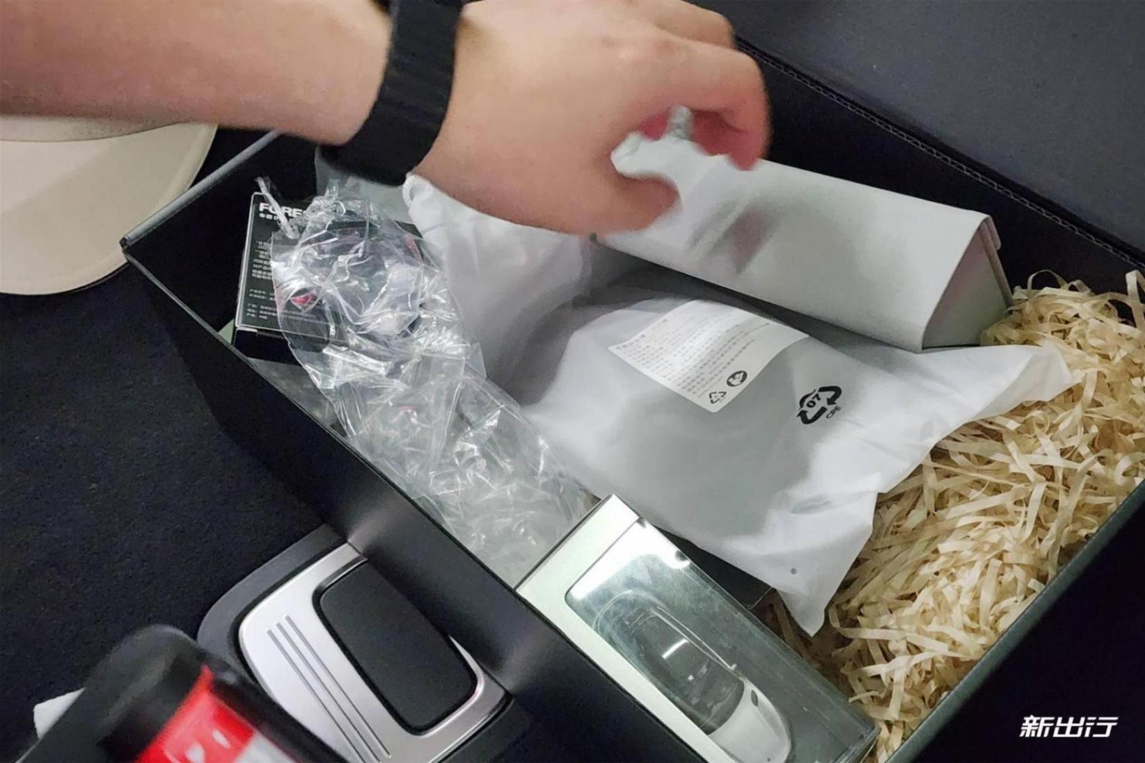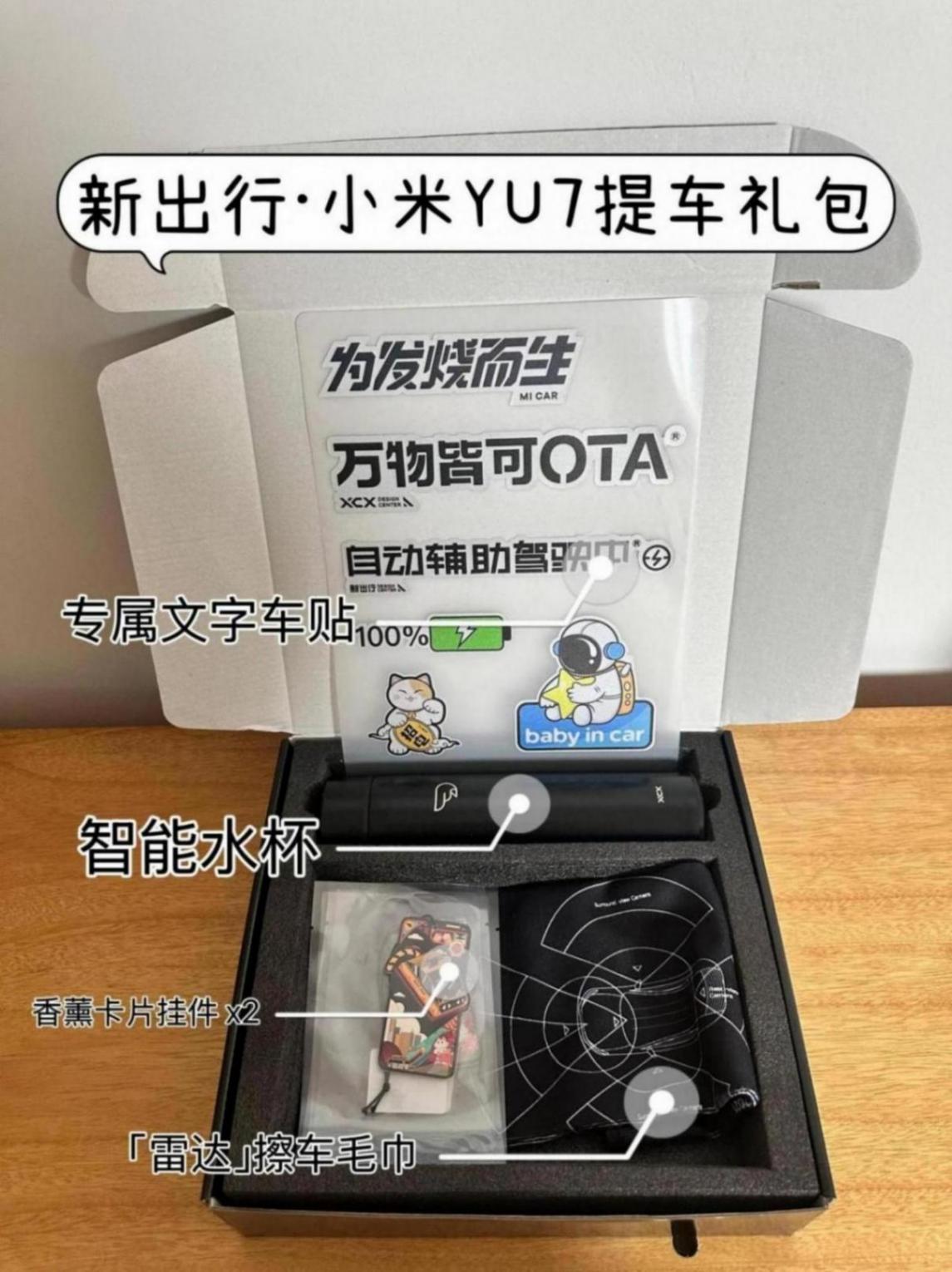 接下來就是簡單的提車啦,小米官方非常貼心地在旁邊擺放了一個祝福的牌子;隨車贈送的就是上次我們在雷總直播間了解到的一些隨車禮物。