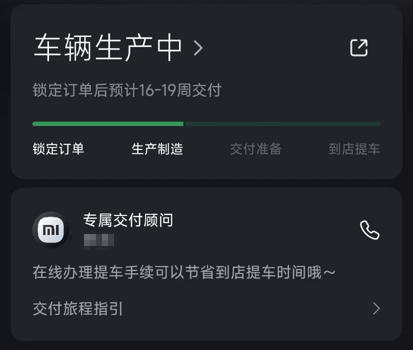而在提車日的最快前一天,我們就會接到小米 YU7 交付顧問的電話,告訴你明天就可以提車了,這個時候手機上的 APP 可能還顯示車輛在生產中,因此對車主們來說,接到這個電話的時候確實會有一點小驚喜。