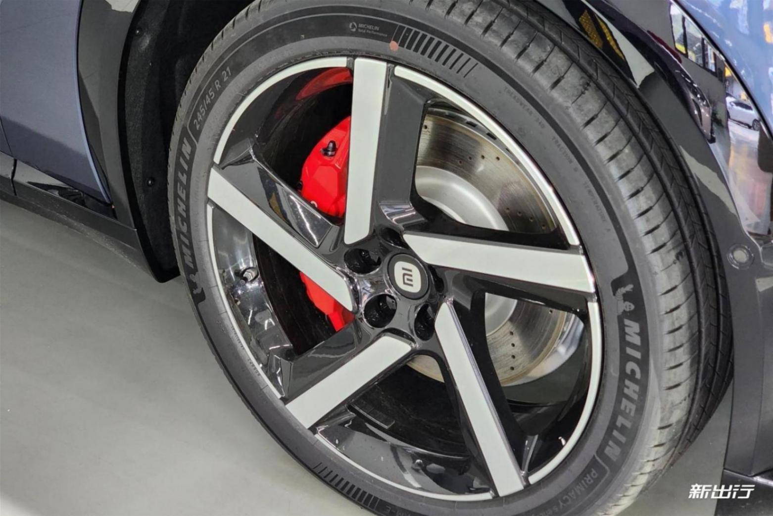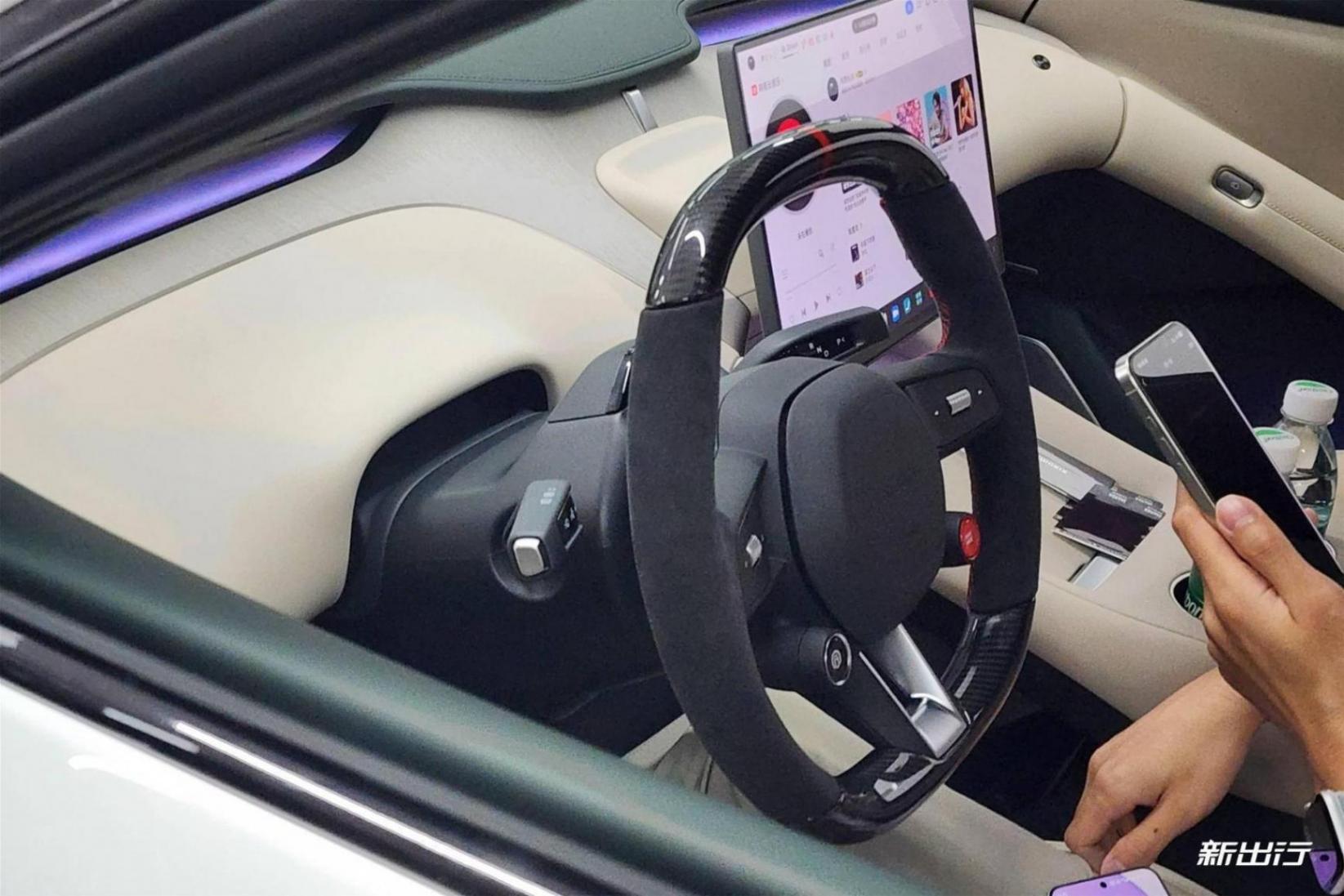當天我也在交付區溜達觀察了一圈,發現首批交付的車源,顏色方面基本都是寒武巖灰,搭配的都是 21 寸幻刃輪轂(選配 12000),匹配的紅色卡鉗(選配 1500),內飾方向盤選裝了碳纖維方向盤(選配 6000)。