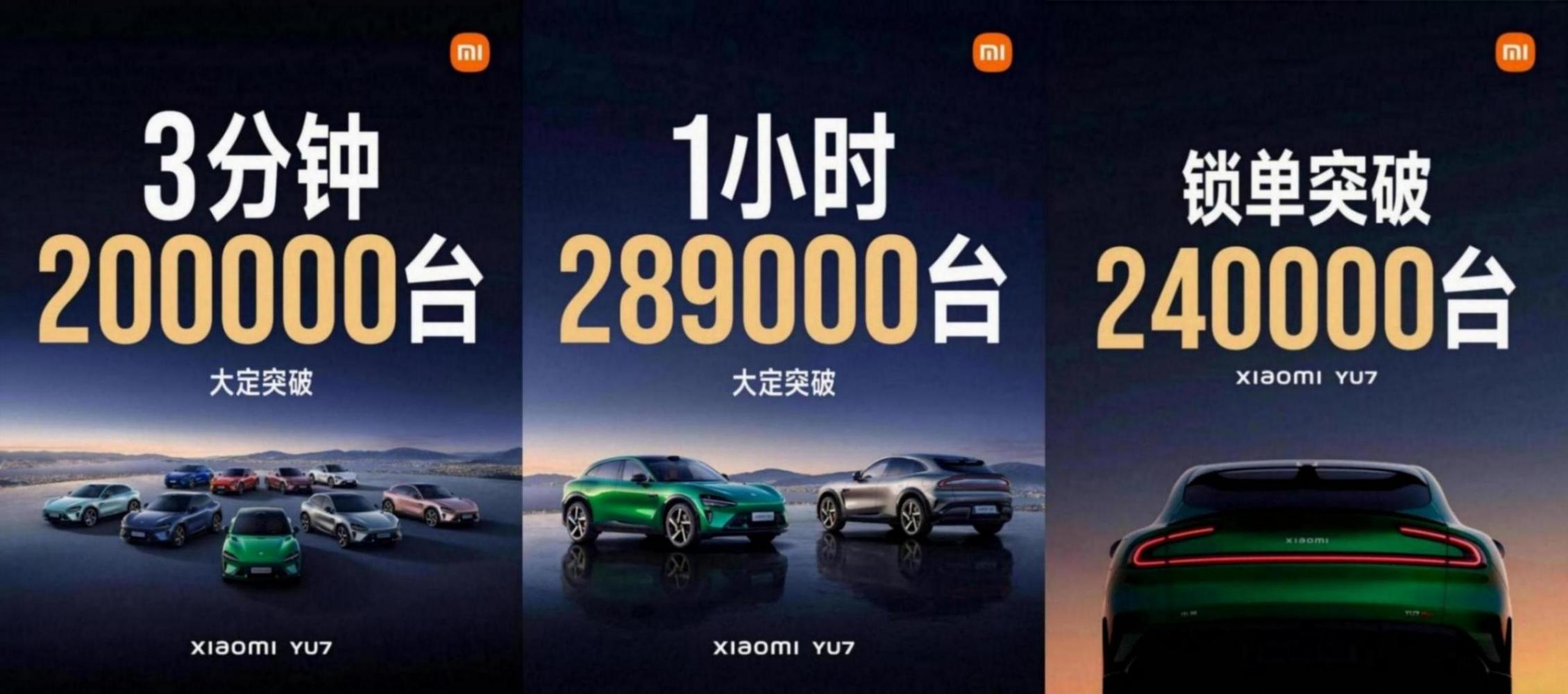 3分鐘大定破20萬臺,1小時大定突破28.9萬臺,開售18小時鎖單量突破24萬臺。的確,小米YU7上市后激增的訂單數(shù),刷新了汽車行業(yè)的記錄。