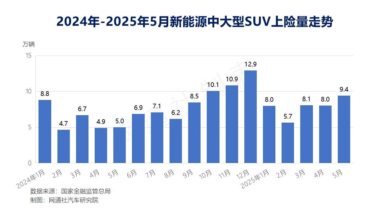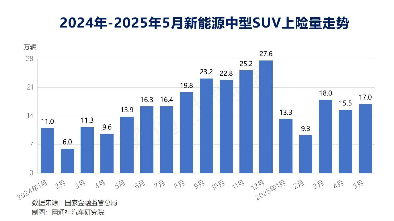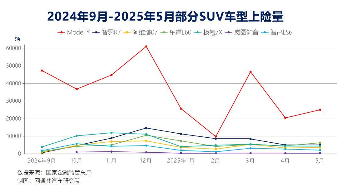 即便是Model Y所在的新能源中型SUV市場,2024年的月度上險量均值只有16.9萬臺,最高值也不過27.6萬臺而已。