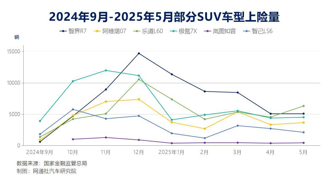 前面提到的這幾款新能源SUV,去年銷量表現(xiàn)較好的智界R7,銷量峰值接近1.5萬輛,但隨后連續(xù)幾個月環(huán)比下滑。峰值銷量同樣超過萬輛的還有樂道L60和極氪7X,月銷量分別來到了五千輛上下。 阿維塔07、智己LS6、嵐圖知音的月銷量均未能達到萬輛,尤其是嵐圖知音,今年以來的月銷量已經(jīng)跌至500輛以下。