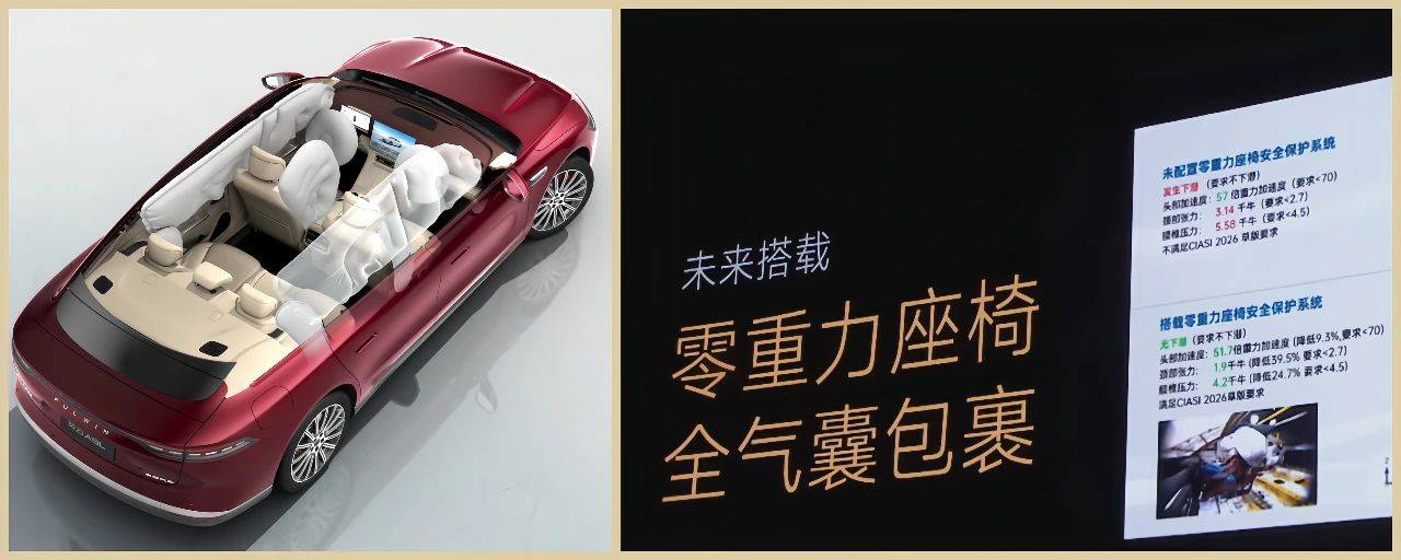 零重力座椅不新鮮。市面上已有十余款車型配備此功能,但它們的前提是“停車狀態”。在行車中放倒靠背,安全帶偏離固定點,氣囊無法形成保護角度,意味著“舒適”與“安全”從未共存。