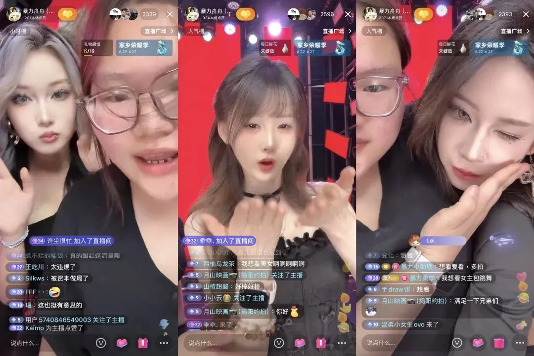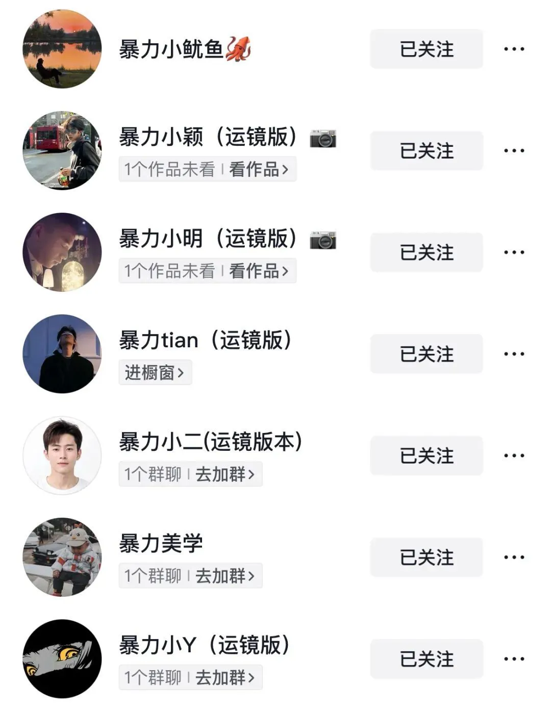 與此同時,運鏡師之間也在構建流量矩陣。舟舟的師兄弟們陸續在抖音開播。賬號命名統一采用“暴力+昵稱+(運鏡ing)”的格式,直播間之間通過PK互動、評論聯動等方式互相引流,逐步形成了一個穩定的“暴力系”賬號網絡。
