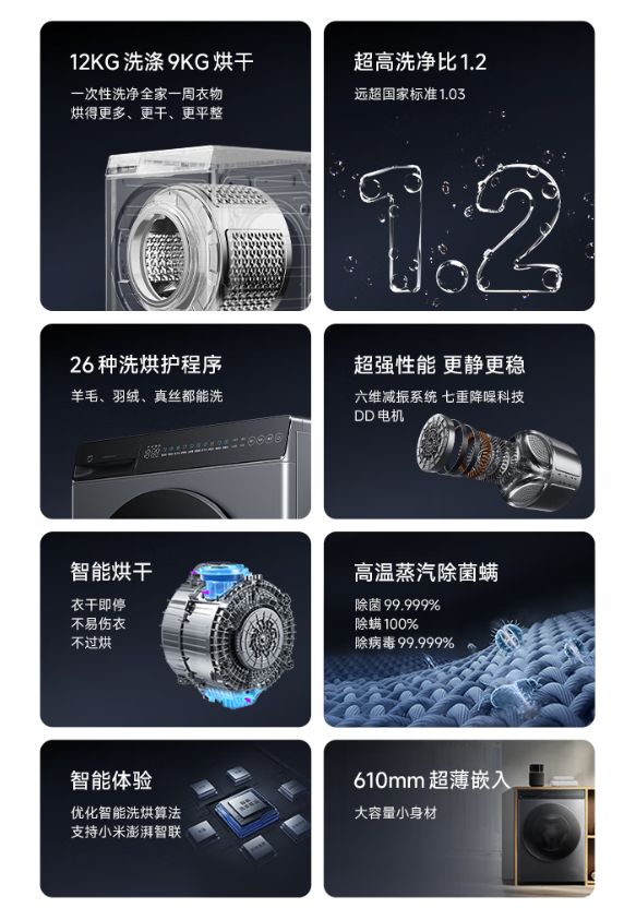 IT之家從商品頁面獲悉,這款新品 12kg 洗滌 + 9kg 烘干,整機深度 610mm,支持超薄嵌入。新品達到超高洗凈比 1.2,遠超國家標準 1.03,支持 26 種洗烘護程序,包括 15min 快速洗等。此外,該產品還支持蒸汽除菌螨、高溫筒清潔、門封噴淋。