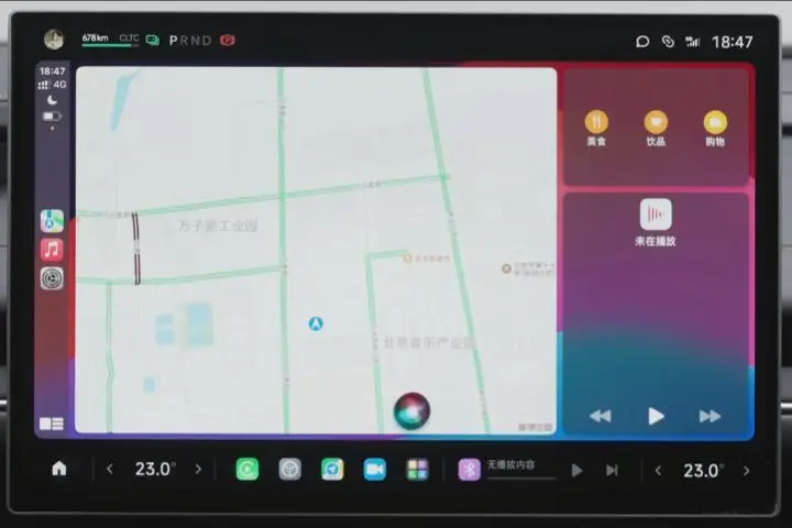 就比如,CarPlay可以作為小米車機的負一屏使用,同樣可以呼叫Siri,在CarPlay里各種操作,然后在底部這些按鈕里無縫跳回原生車機...