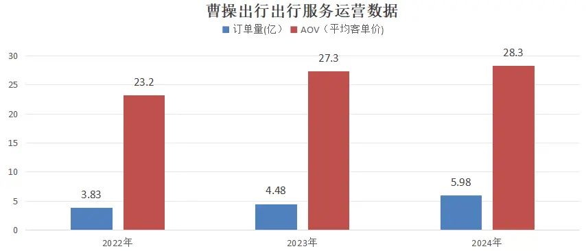 數據顯示,曹操出行近年來在出行服務領域發展不錯,近三年其出行服務運營數據量價齊升:2022-2024年,公司訂單量分別為3.83億、4.48億、5.98億單,同期平均客單價分別為23.2元、27.3元、28.3元。