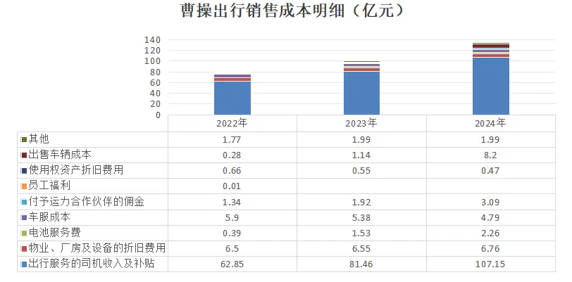 因此,曹操出行主要成本是在司機收入及補貼、折舊費用及車服成本上。其中,司機收入及補貼是最大的成本項,2022-2024年,曹操出行的司機收入及補貼成本分別為62.85億元、81.46億元及107.15億元。