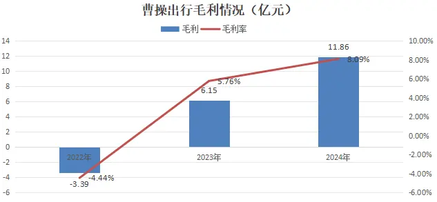 對應地,曹操出行的毛利率并不算高,其毛利率在2023年才開始轉正,2024年錄得毛利11.86億元。同期,公司毛利率為8.09%,出行服務毛利率8%。