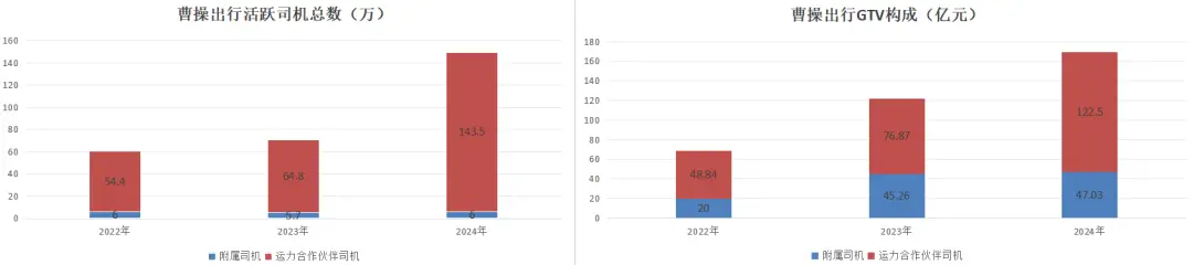 數據顯示,曹操出行自聚合平臺獲得的訂單量與GTV占比從2022年的51.4%、49.9%分別增長為2024的85.7%、85.4%。