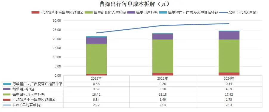 測算曹操出行發現,其24年每單網約車訂單價格為28.3元,補貼給用戶4.59元,再扣除交付給聚合平臺的傭金與廣告費用后,每單浮盈3.9元,較24年4.19元降低。