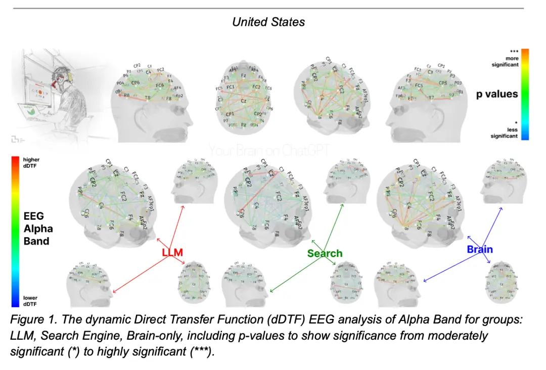 首先是概念的誤讀。部分報道稱“大腦萎縮47%”,但MIT研究測量的是神經連接活躍度的變化,而非大腦結構的物理萎縮。研究發現,依賴ChatGPT寫作的參與者,大腦在任務中的神經耦合強度比純思考組降低了約47%。這并不意味著大腦“退化”,而是表明AI輔助下,大腦執行特定任務時的某些認知區域活躍度降低。