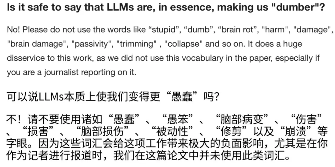 2.實驗設置與真實環境不同。在20分鐘內完成一篇SAT風格的哲學論文是一個高度結構化的任務。將高壓限時的單一任務產生的結果等同于整體認知能力的下降,簡化了現實情況。真實工作中,人們使用AI的過程是一個非線性、多步驟的互動,有更充裕的時間進行反思和調整,這種差異可能夸大了研究中的負面效應。