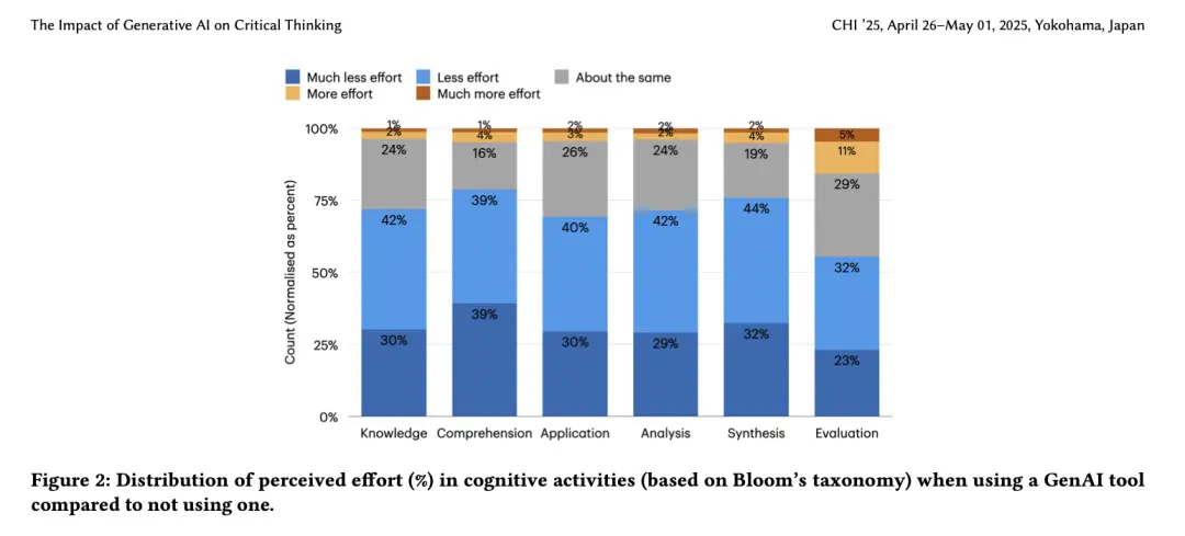 2025年2月,一份來自微軟研究院和卡內基梅隆大學的研究《The Impact of Generative AI on Critical Thinking: Self-Reported Reductions in Cognitive Effort and Confidence Effects From a Survey of Knowledge Workers》,通過對319名知識工作者的調查發現,當用戶對自身在該領域的專業能力有信心時,使用AI反而會激發更多的批判性思維。