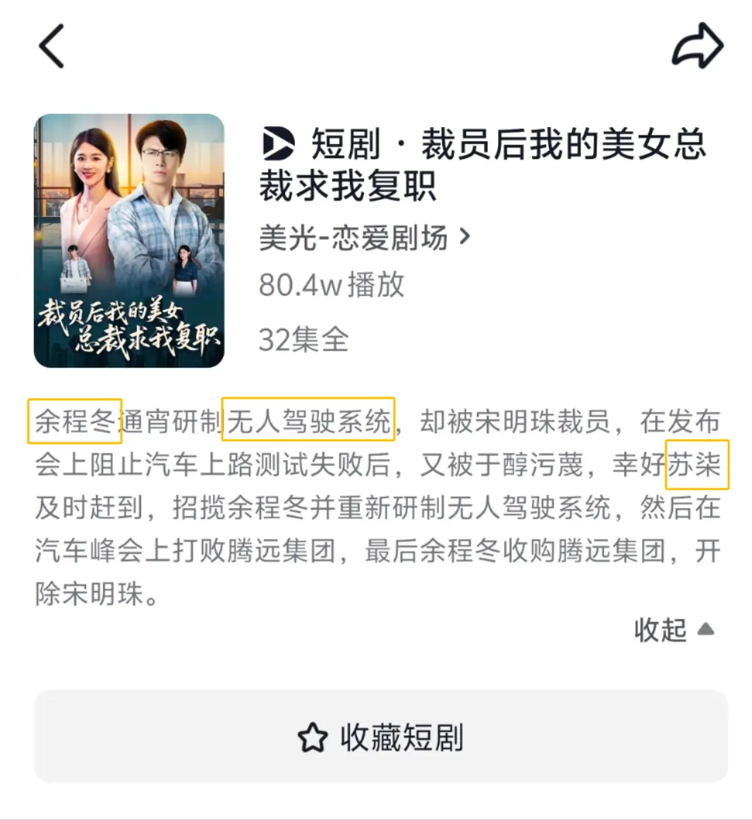 今年6月,某平臺上線了一部名為《裁員后我的美女總裁求我復職》的短劇。該短劇存在多處劇情、人設與現實生活中華為、小米的業務相似,如,男主角名為余程冬,他被驍米集團挖走,且專注于無人駕駛領域。