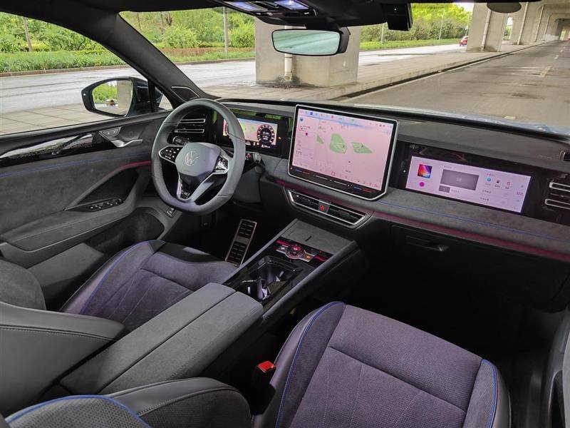 進入車內,大眾途觀L Pro的整體設計風格還是橫平豎直的線條,勾勒出了不錯的立體感和層次感,R-Line版本則采用了大面積麂皮材質進行覆蓋,新車配備10.3英寸全液晶儀表、15英寸中控屏和11.6英寸副駕娛樂屏,中控屏內置8155芯片。別克昂科威Plus則配備30英寸一體式曲面6K屏幕,同樣內置8155芯片,搭配藍白拼接的皮質包裹,營造了更高級的車廂氛圍。而在配置部分,途觀L Pro多出了前排座椅按摩、手機無線充電和后排獨立空調等,昂科威Plus則配備前排隔音玻璃、后排隱私玻璃和主動降噪功能等,靜謐性更好。