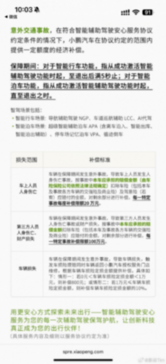 此前有車企試行“智駕無憂服務”,提供了百元級別的權益上限,但車企方要求,出事前必須處于智駕狀態未退出,且車主必須為責任方且需由商業險和交強險先行賠付。相較于此,小鵬推出的“智能輔助駕駛安心服務”,則將賠付范圍放寬至小鵬NGP推出5秒內,價格也較低,僅為239元/年,最高可賠付100萬元。